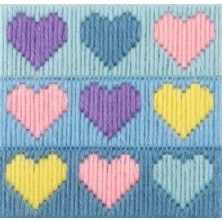 El kit 1st Long Stitch – Hearts de Anchor presenta todos los materiales que necesitas para formar este cuadro divertido de corazones de colores formados por líneas verticales bordadas. Esta técnica es divertida de realizar, y es apta tanto para niños como para adultos.