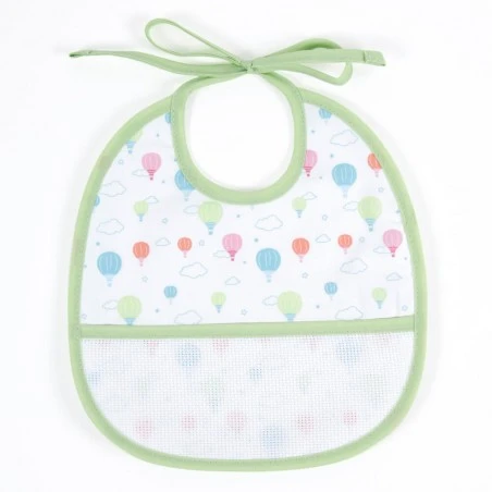 El babero está hecho en una tela 100% algodón cómoda sobre la piel de los bebés. La tela cuenta con un estampado de globos aerostáticos en diferentes colores y se encuentra rematada con un bies de color verde.