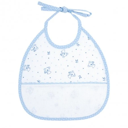 El babero está hecho en 100% algodón y lo tienes disponible en dos tallas: 3 y 6 meses. También está disponible en tres colores diferentes para que elijas tu favorito: azul, rosa o gris. Todas las opciones presentan un diseño de koalas bebés estampados. Incluye un ribete de bies con estampado de lunares, en color característico del babero.
