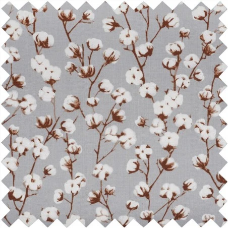 Su diseño está compuesto por flores de algodón sobre un fondo gris.