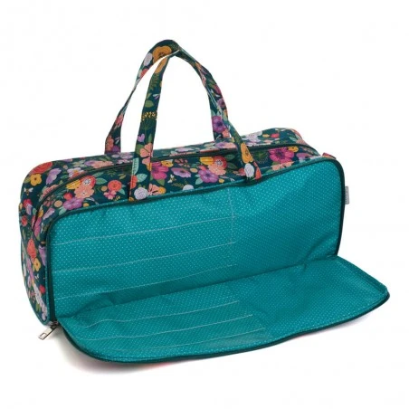 La bolsa de labores Floral Garden Teal se divide en dos compartimentos: uno con medidas especiales para organizar agujas de tricot de hasta 40 cm de longitud, y otra sección ideal para organizar tus lanas y accesorios para tejer.