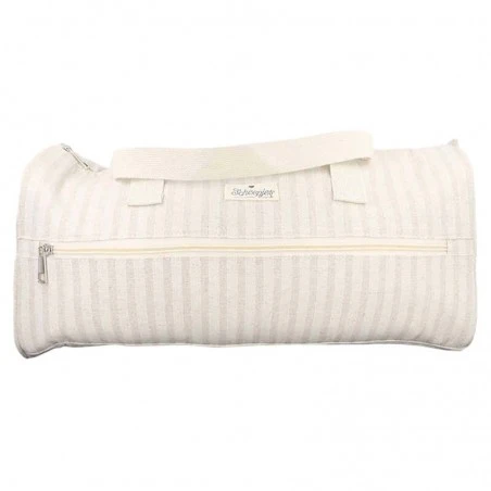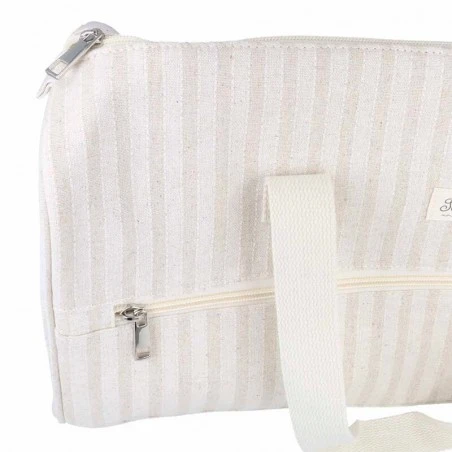 Además, cuenta con un bolsillo adicional con cremallera en el exterior, perfecto para almacenar pequeñas herramientas para manualidades, como tijeras o marcadores de punto, además de cualquier accesorio que necesites tener a mano. Está fabricada con una tela resistente de 70% poliéster y 30% algodón. Esta bolsa ofrece durabilidad y estilo en un discreto estampado de rayas beige y blancas.