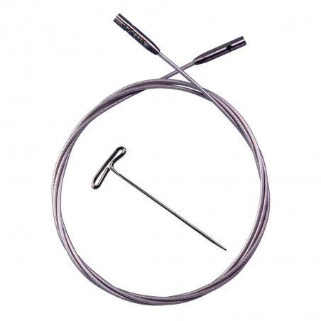 El cable está fabricado en acero y cuenta con un revestimiento de nailon de color plateado. Esta combinación de materiales ofrece la combinación perfecta de durabilidad y deslizamiento suave a través de las puntadas. El cable se mueve sin esfuerzo a medida que tejes, lo que te permite mantener un ritmo constante y fluido en tu trabajo.
