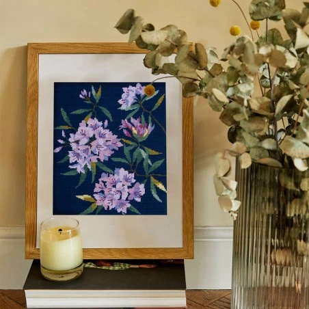 El diseño en cuestión son hermosas flores lilas de la planta Rhododendrons, parte de la inspiradora colección Flores Clásicas de DMC, lo que aporta un toque artístico a tu proyecto de bordado. Además, la tela es de cañamazo DMC Penélope con una densidad de 4 puntos por centímetro, lo que ofrece agujeros amplios que permiten trabajar con facilidad cada punto.
