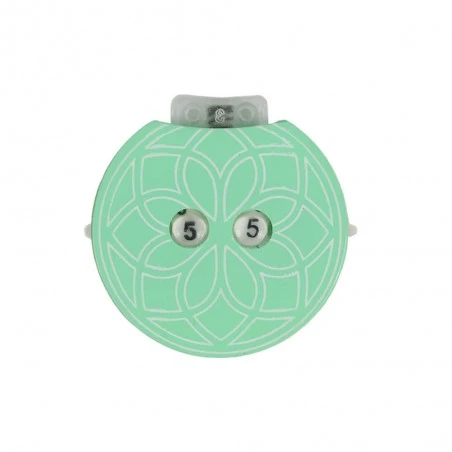 Es útil para realizar un seguimiento de aumento o disminución en punto o ganchillo. Cuenta con un diseño de mandala, característico de la colección Mindful de KnitPro. La carcasa es de un color verde azulado muy suave.