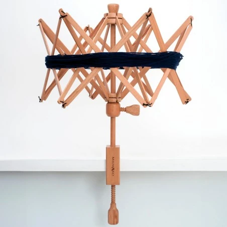 Con una abrazadera que se ajusta fácilmente a cualquier mesa o superficie de hasta 4,5 cm de espesor, esta devanadora asegura la estabilidad sin dañar la superficie. Su forma de paraguas se adapta a la circunferencia de cualquier ovillo, obteniendo una circunferencia máxima de madeja de 165 cm.