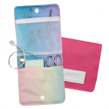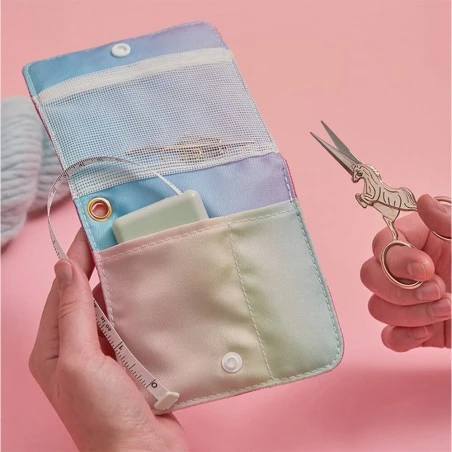 El Estuche con Accesorios addiUnicase de addi es un imprescindible para cualquier aficionado al punto y crochet. Con un diseño mágico de unicornio, este estuche compacto y práctico contiene todo lo que necesitas para trabajar tus proyectos: una cinta métrica, tijeras doradas en forma de unicornio, 5 marcadores de punto y una aguja de bordar.