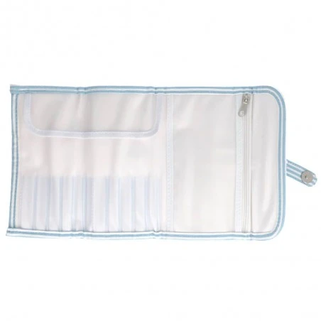 Sobre los 10 huecos para organizar diez agujas de ganchillo encontrarás una solapa encargada de proteger las puntas de las agujas para evitar que se estropeen.