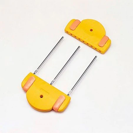Esta herramienta consta de dos piezas amarillas hechas de Resina ABS y poliacetal que miden 10 x 5 cm, y 3 varillas metálicas de aluminio de 12 cm de longitud que encajan perfectamente en los huecos de las piezas amarillas.
