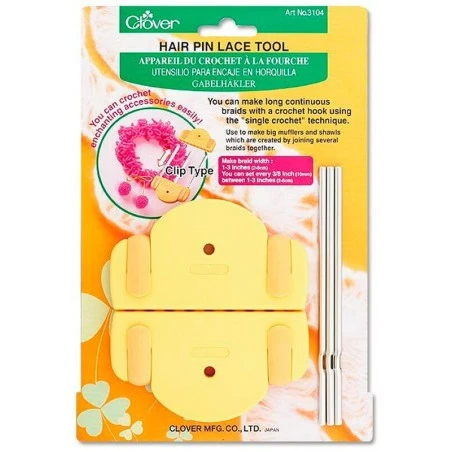 La Herramienta para encaje en horquilla de Clover te servirá para tejer a ganchillo piezas trenzadas que podrás unir para realizar originales diseños personalizados. Se incluyen las piezas necesarias para montar la herramienta y poder tejer tus labores.