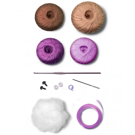 Encontrarás hilo de algodón Circulo Amigurumi, cinta de satén, ganchillo de 3 mm, aguja para coser, ojos de seguridad, fibra de relleno, un bloqueador de puntos y detalladas instrucciones en español, inglés y portugués.