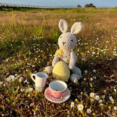 Este patrón de amigurumi incluye un toque de bordado, específicamente el nudo francés, que agrega un nivel extra de detalle y carácter al conejito. Su nivel de dificultad es intermedio, por lo que se aconseja tener conocimientos previos en el ganchillo.