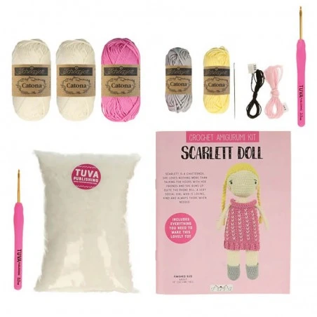 El kit de amigurumi Muñequita Scarlett es un set que contiene todos los materiales que necesitas para crear esta simpática muñeca de ganchillo.