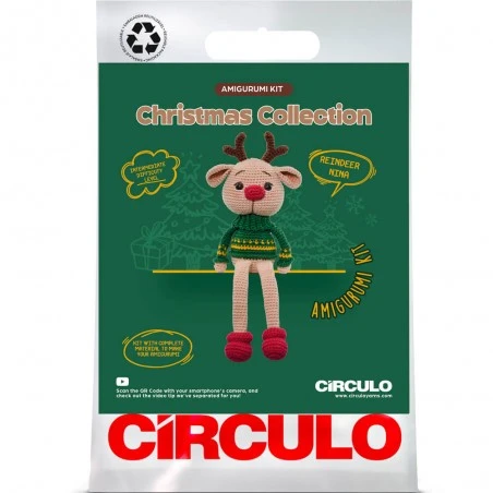 El Kit Amigurumi – Reno Nina – Circulo te permite crear un encantador reno navideño de ganchillo de 32 cm de altura. Este completo kit incluye todos los materiales necesarios para tejer el muñeco, garantizando una experiencia divertida de creatividad.