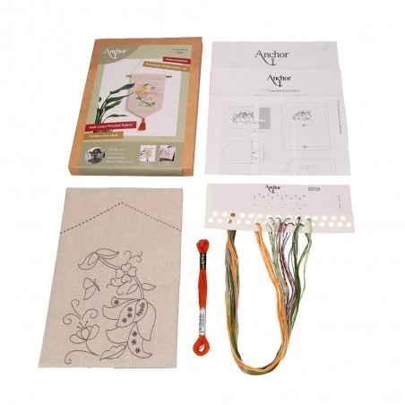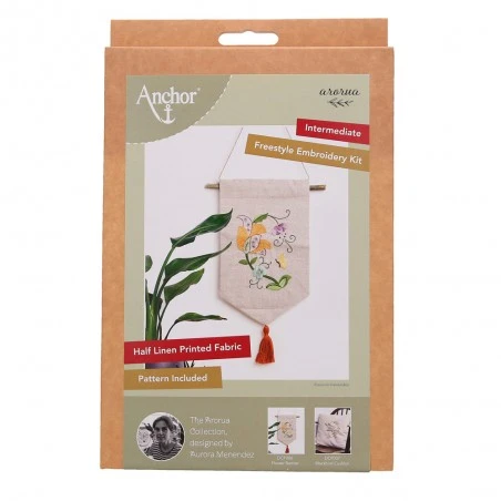 El Kit Aurora Freestyle Anchor Essentials – Bandera de flores incluye los materiales que se necesitan para trabajar esta bandera bordada, perfecta para decorar el hogar.