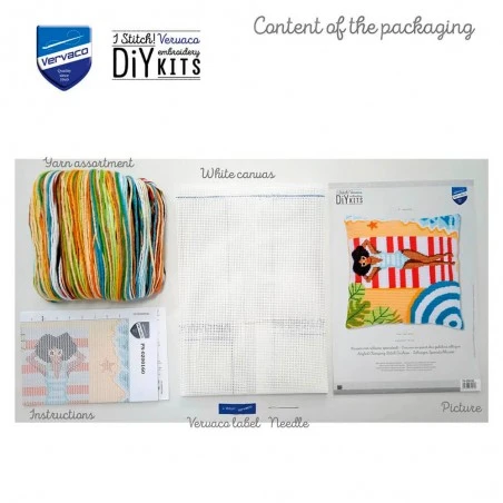 En el kit encontrarás un cañamazo de algodón blanco de alta calidad con una densidad de 34 agujeros por cada 10 centímetros, que servirá como base para tu bordado. Además, se incluye hilo grueso 100% acrílico en los colores necesarios para crear el diseño playero, así como instrucciones en ocho idiomas, una imagen del trabajo terminado y una aguja para bordar.
