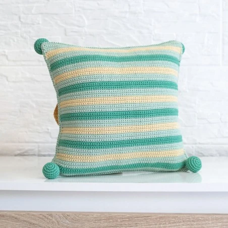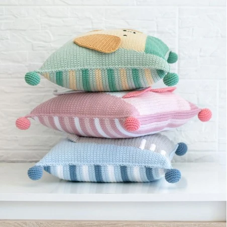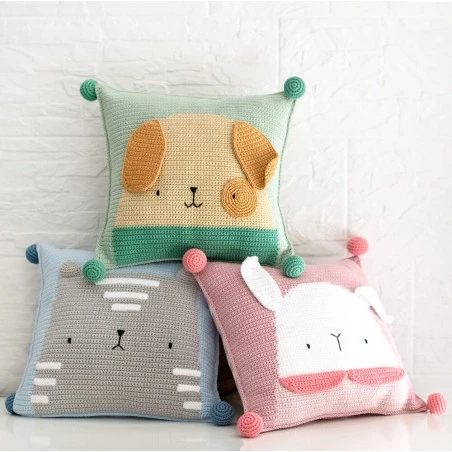 Este cojín de perrito es perfecto para decorar habitaciones infantiles. Cuenta con un tamaño de 30 x 30 centímetros una vez finalizado. El patrón te explica como tejer 4 pompones para decorar las esquinas del cojín.