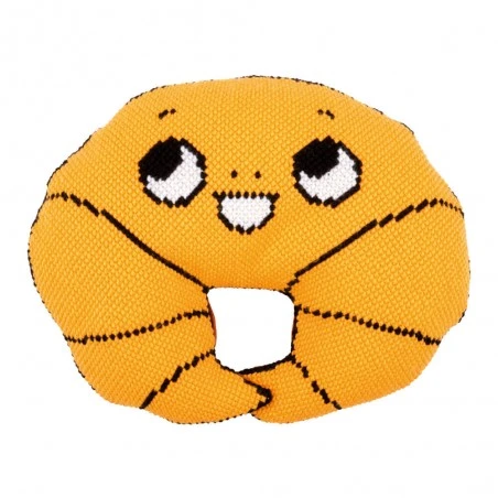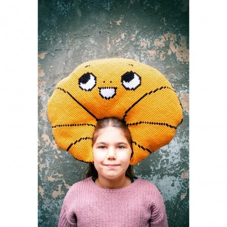 El contenido del kit te permite trabajar un cojín con forma de croissant con carita bordado a punto de cruz, que se convertirá en el nuevo compañero de los niños. ¡Es un regalo perfecto para ellos! El croissant cuenta con un tamaño de 48 x 43 centímetros una vez finalizado.