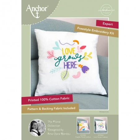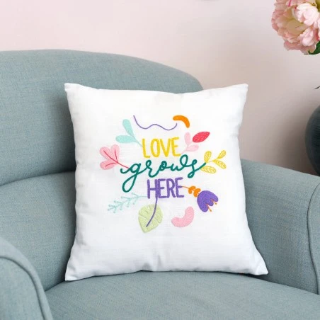 El kit de bordado Cojín Love Grows de Anchor presenta todos los materiales necesarios para crear un divertido cojín con un bordado multicolor. El diseño presenta la frase «Love Grows Here» en español «El amor crece aquí», bordada en colores llamativos y originales. La frase se encuentra adornada con ramas, hojas y flores a su alrededor.