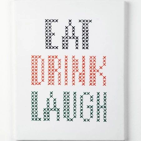 Esta tela contiene un mensaje: “eat drink laugh” que podría traducirse como “come, bebe, sonríe”, tres cosas indispensables en nuestro día a día. Los colores que componen estas palabras son vivos. La palabra “eat” está bordada en azul, “drink” en naranja y “laugh” en verde.