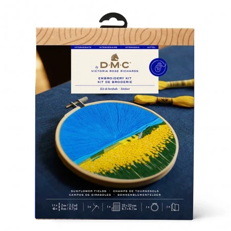 El Kit de Bordado Tradicional – Campos de Girasoles de DMC te brinda la oportunidad de crear una hermosa obra de arte con un diseño llamativo y moderno. Creado por la talentosa bordadora inglesa Victoria Rose Richards, este diseño utiliza la dirección de la puntada para representar un amplio cielo y el punto de nudo para añadir textura al primer plano, creando unos bonitos girasoles.