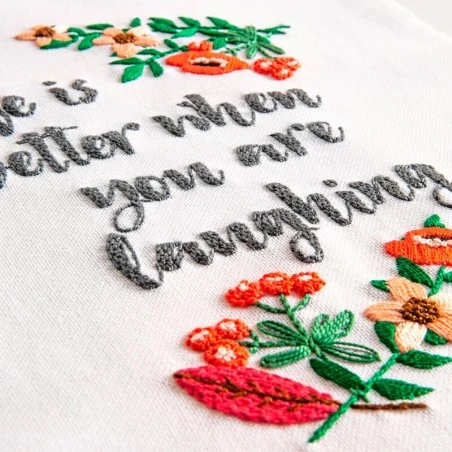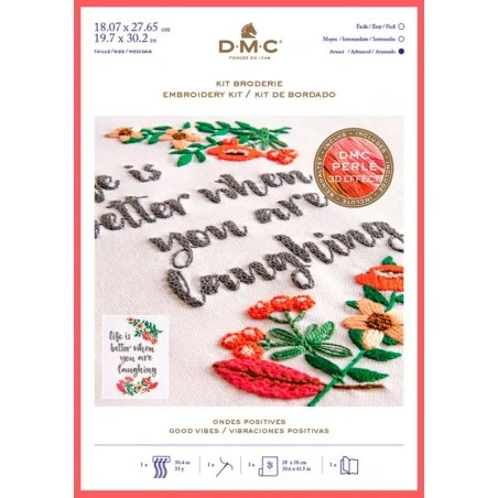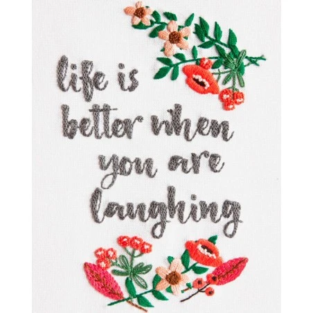 Gracias al Kit de bordado de DMC bordarás una cita en color gris llena de energía positiva. En la zona superior e inferior del texto encontrarás flores en tonos rosas con hojas verdes.