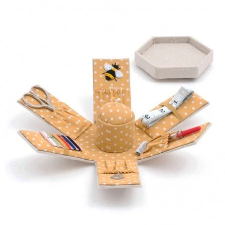 Este Kit de Costura Panel de la colección Applique Bee es un set completo con utensilios de costura. En cada uno de sus laterales, un total de 6, podrás encontrar un utensilio diferente, y en medio, un alfiletero con varios alfileres.