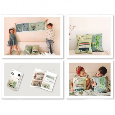El kit incluye los materiales que necesitarás para completar este proyecto sencillo y divertido. Dentro del estuche Kits & Fun encontrarás un panel de tela con 4 diseños, para la parte delantera y trasera de 2 cojines, y la floca para rellenarlos.