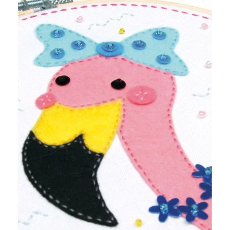 El Kit de Fieltro con Bastidor – Flamingo de Vervaco incluye los materiales necesarios para trabajar esta manualidad tan divertida. Es apto para trabajar por niños o adultos que deseen crear este original flamenco con lacitos y flores.