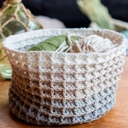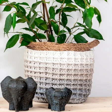 Tiene un tamaño aproximado de 15 centímetros de diámetro y 18 centímetros de altura. Se trabaja con el hilo Wavy Blends, un material de colores degradados que formará una combinación única en tonos naturales sin necesidad de cambiar de ovillo. La mezcla de tonos va desde gris claro hasta blanco, pasando por un marrón arena.