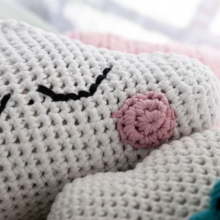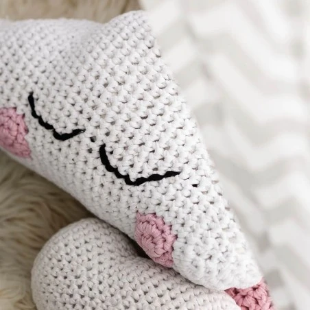 Esta nube presenta una adorable carita con mofletes rosados y ojos cerrados. Es ideal como cojín decorativo para dormitorios infantiles, como juguete para la cuna o simplemente para hacer compañía a los más peques de la casa.