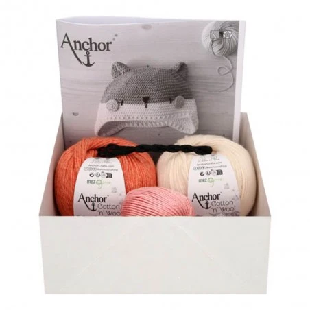 En el interior del kit encontrarás todos los materiales necesarios para tejer este gorro de zorro diseñado por Airali_gray. Se propone hilo Anchor Cotton ‘n’ Wool, compuesto por una mezcla de algodón y lana para conseguir un tacto suave, cálido y agradable para estar en contacto con la piel de los más pequeños.