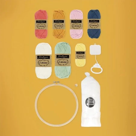 Se incluye Scheepjes Catona, un hilo de algodón mercerizado que brinda un hermoso brillo y una sensación suave al tacto. Además del hilo, el kit también contiene el bastidor y el relleno para amigurumis, todo lo necesario para completar el proyecto.