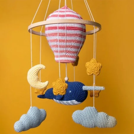 - Kit con todos los materiales incluidos para tejer en ganchillo un móvil de cuna para bebé.