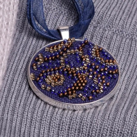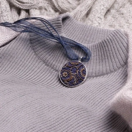 Para realizarlo simplemente tendrás que poner la tela donde hayas bordado las cuentas en el colgante. La tela es 100% algodón y podrás realizar estampados abstractos de color dorado, bronce y azul. La base del colgante es plateada, como el cierre. La cadena se divide en tres cuerdas y una cinta organza de color azul oscuro. Los colores combinan muy bien entre sí.