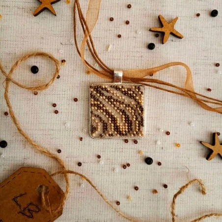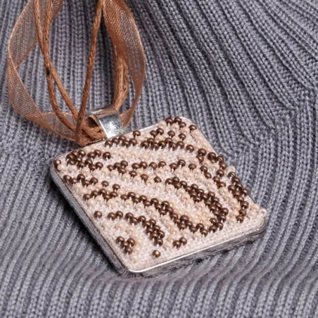 Podrás confeccionar este collar cuadrado bordando las cuentas beiges y bronces sobre la tela beige oscuro, creando un bonito estampado. Una vez lo hayas acabado, tendrás que meter el colgante en la cadena de color beige. Tanto la base colgante como el cierre son de color plata.