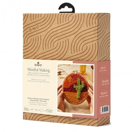 El kit de punch needle para principiantes Desierto de DMC te ayudará a iniciarte en esta técnica de bordado relajante. El diseño representa el desierto con dunas de arena, temperatura cálida y un característico cactus en el frente. El bordado en relieve juega con diferentes profundidades.
