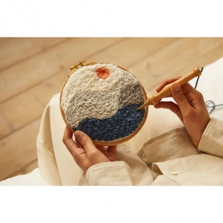 En el interior del kit encontrarás todos los materiales necesarios para poder bordar este bastidor con un diseño original de montañas en relieve con la técnica punch needle. Las montañas se presentan en diferentes colores para jugar con la profundidad.