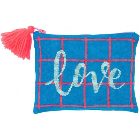 Su fondo es azul, con un forro interior en blanco con puntitos rosa flúor que contrastan y le dan un toque superatrevido. Bordarás cruz a cruz la palabra amor, ¡como el cariño y aprecio que sientes por todo lo que guardarás en su interior!