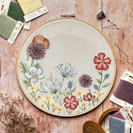 El Kit de Punto de Cruz Linen Meadow Mouse de Anchor contiene todo lo que necesitas para crear un bordado lleno de dulzura, con un simpático ratón jugando entre flores.