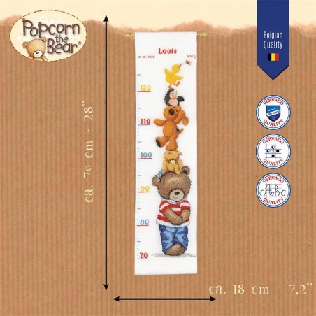 Con el Kit de Punto de Cruz Medidor de Altura Popcorn and Friends de Vervaco podrás crear un medidor de altura infantil bordado en punto de cruz, perfecto para tomar las medidas de los niños. Este medidor te ayuda a seguir el crecimiento de los niños, y además, es un conmovedor recuerdo personalizado perfecto para decorar habitaciones infantiles.
