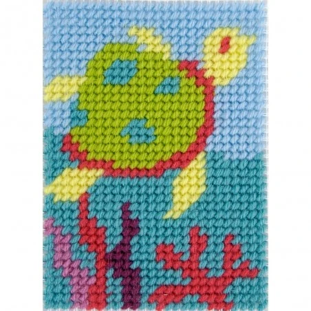 El kit incluye todos los materiales necesarios para trabajar el tapiz de la tortuga, incluida la tela de cañamazo con el dibujo impreso y los agujeros grandes para facilitar el trabajo. Por ello, es perfecto para niños o personas sin experiencia en esta técnica.