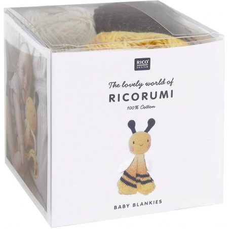 Para dar vida a tu abeja doudou, el kit ofrece un total de tres ovillos del hilo Ricorumi DK y un ovillo de hilo Ricorumi Spin Spin DK, ambos fabricados con 100% algodón de alta calidad. Los hilos son suaves al tacto y perfectos para la delicada piel del bebé.