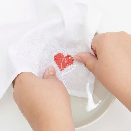 La simplicidad es clave con este kit. Coloca la tela soluble con el diseño sobre tu prenda, borda siguiendo las instrucciones y, tan solo mojando con agua, retira la tela soluble para revelar tu parche bordado perfectamente integrado en tu prenda favorita.