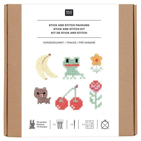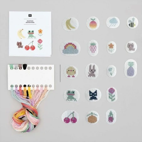 Con este kit, podrás crear hasta 18 parches bordados con motivos encantadores, desde frutas como cerezas y plátanos hasta adorables animales como gatos y pollitos, además de flores y un hermoso arcoíris. Algunos de los diseños utilizan la técnica de bordado Pixel Art, donde se borda formando pequeños cuadrados.