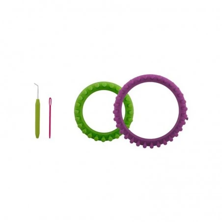 Disponibles 2 kits con 2 telares redondos cada uno. El primer kit incluye telares más pequeños, 1 telar de 13,75 cm y 1 telar de 18,75 cm. El otro kit incluye 2 telares de tamaño mayor, siendo 1 telar de 23,75 cm y otro de 28,75 cm.
