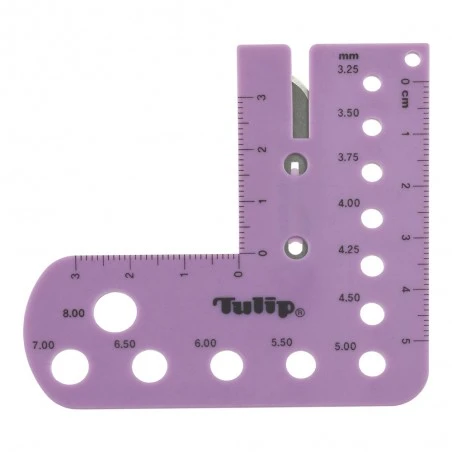 Con este útil podrás saber en todo momento el grosor de tus agujas de punto o circulares. Con el tiempo y el uso, en muchas de tus agujas desaparece la referencia en milímetros que lleva estampada. Gracias a este accesorio de Tulip podrás saber su grosor en cualquier momento.