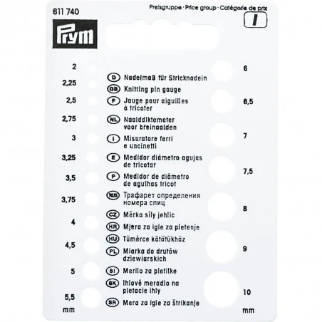 El calibrador es una tarjeta de plástico resistente que incluye 19 agujeros en diferentes diámetros. Con estos agujeros podrás averiguar grosores de agujas de punto de entre 2 mm y 10 mm. Tan solo debes introducir la aguja en cada agujero para encontrar el que mejor se adapta a ella. Una vez que lo tengas, en el lateral encontrarás el número indicado.