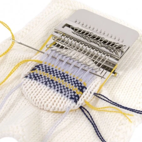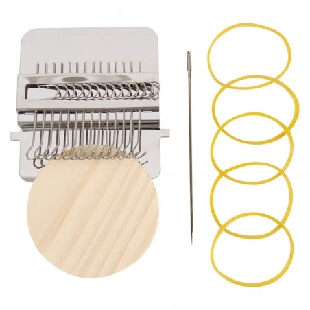 Además del mini telar, este set incluye otras piezas y herramientas prácticas para utilizar junto con el telar.