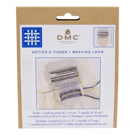 Dentro del paquete, encontrarás una presentación detallada del producto en inglés y francés, un esquema de tejido y el código QR que te dirigirá a un tutorial en el sitio web de DMC, proporcionando instrucciones claras sobre cómo utilizar el telar para crear tejidos sencillos.